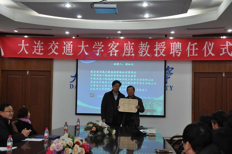 2013年1月9日,應大連交通大學邀請,我公司董事長周和生先生受聘為大連交通大學工程管理類學科客座教授,頒發(fā)客座教授聘書。