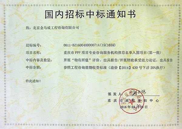3月28日,北京金馬威工程咨詢有限公司經(jīng)重慶市政府采購中心評審,中標(biāo)重慶市PPP項目專業(yè)咨詢服務(wù)機(jī)構(gòu)推薦名單入圍項目(第一批)。