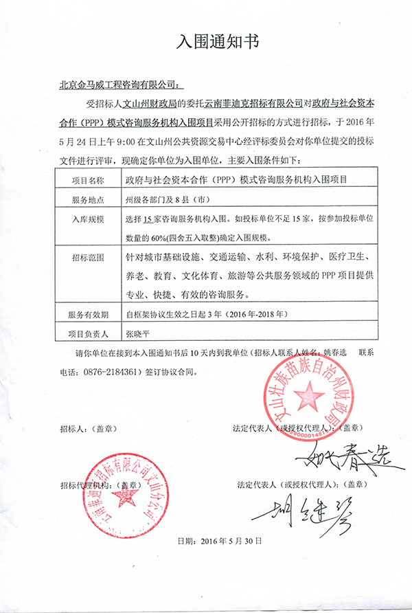 北京金馬威工程咨詢有限公司入圍“文山州財(cái)政局政府與社會(huì)資本合作(PPP)模式咨詢服務(wù)機(jī)構(gòu)入圍項(xiàng)目”
