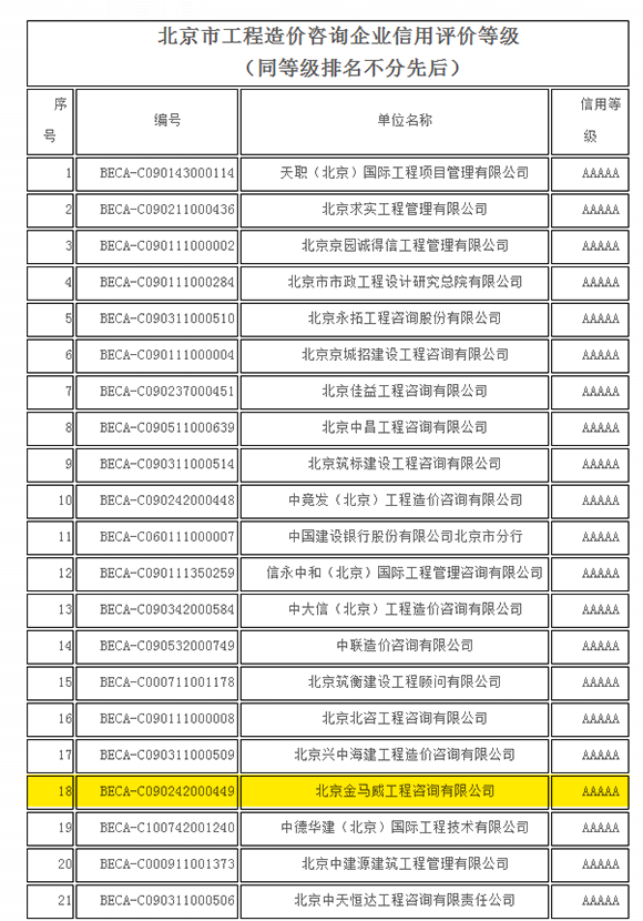 根據(jù)《關(guān)于開(kāi)展2016年工程造價(jià)咨詢企業(yè)信用評(píng)價(jià)工作的通知》(中價(jià)協(xié)[2016]54號(hào))文件的要求,北京市建設(shè)工程造價(jià)管理協(xié)會(huì)(簡(jiǎn)稱京價(jià)協(xié))開(kāi)展了北京市工程造價(jià)咨詢企業(yè)信用評(píng)價(jià)工作。